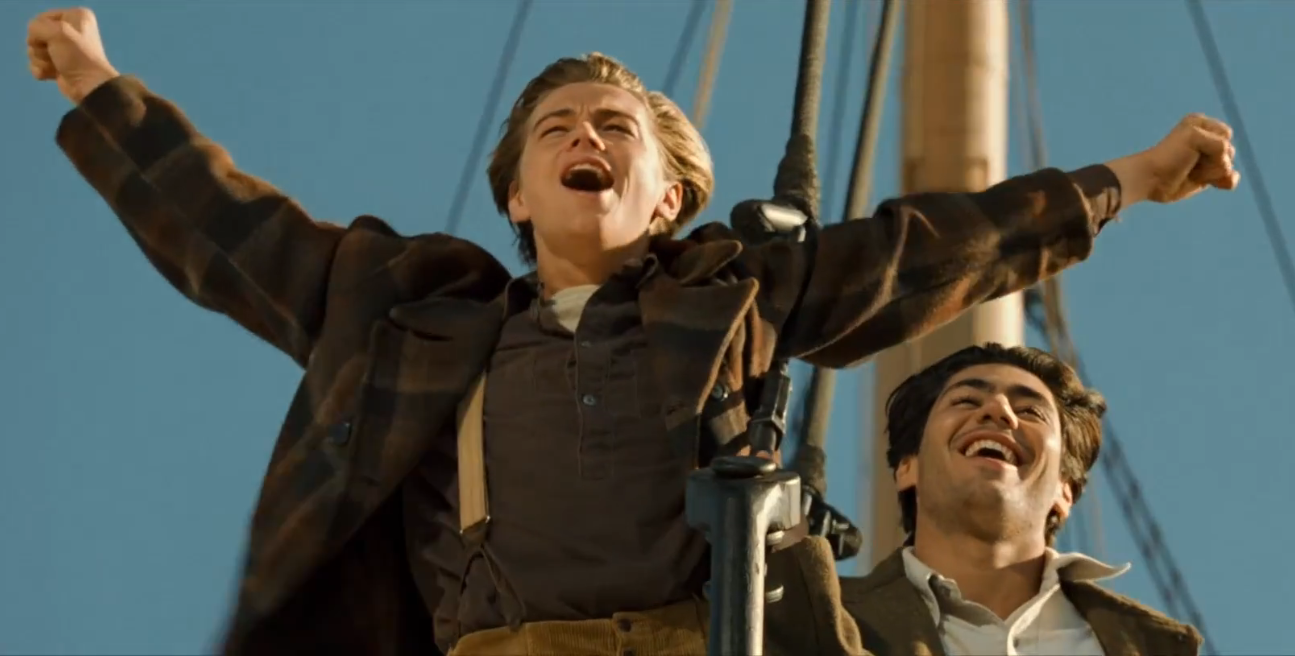每个人都知道,这是《泰坦尼克号》中最著名的一幕,莱昂纳多·迪卡普里奥的角色在这艘注定要沉的船头上大声喊了这句经典台词。这也是电影业最喜欢引用的经典台词之一。卡梅隆在接近十亿的电视机观众面前,对着长期诅咒他的人和所有反对者,特别是那些坐在他面前的人,大大的‘一吐怨气’。”